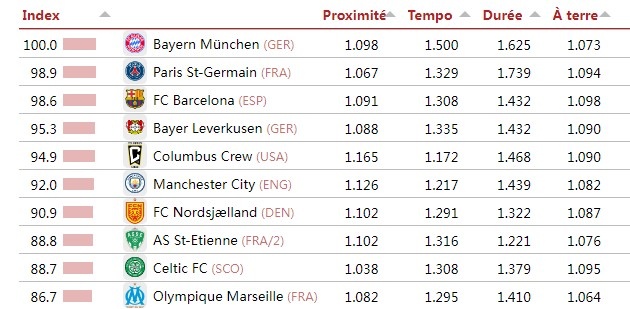 排名第一的拜仁获得了100分的综合评分(即其他球队以拜仁的100分作为综合指标),巴黎、巴萨作为二、三名分获98.9和98.6分。